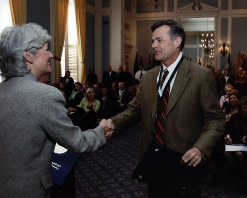 Oklahoma Secretary of State Susan Savage welcomes Alan B. Hollingsworth to a podium at the state capitol to discuss his novel, University Boulevard, nominated for book of the year in the Oklahoma Reads Oklahoma contest, celebrating the Oklahoma Centennial.