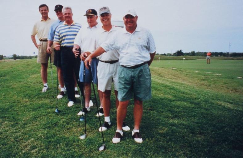 The book’s success prompted a reunion of former El Reno High School golf team members, in the form of a Flatbellies golf tournament and dinner. Of those attending, this photo (used by the El Reno Tribune) included team members who had served as the basis for characters in the book. Front to back: Fletcher Handley, Tim Dylina, Drew Hodges, Jack Hodgkinson, Andy Bass, and author Alan Hollingsworth.
