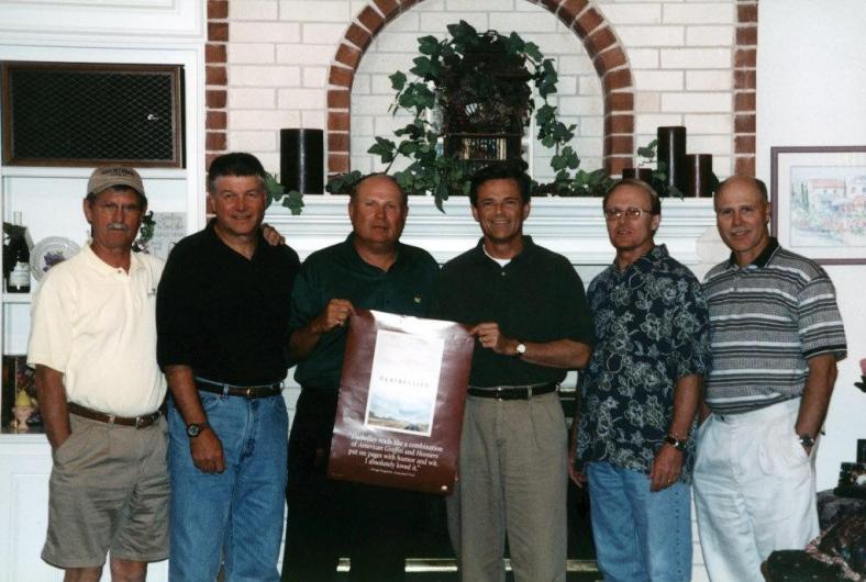 Many of the antics of the boys in Flatbellies were derived from a group that humbly named themselves “The Magnificent Seven.” While 5 of the 7 were on the golf team, the group met for their reunion the evening before the Flatbellies golf tournament. L to R: Mike Cole, Jim Brinkley, Fletcher Handley, Alan Hollingsworth, Andy Bass, Tim Dylina (not pictured: Steve Arthurs).