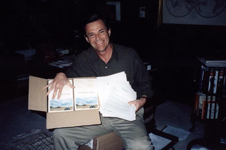 The moment about which every writer dreams – the shipment arrives where the author sees the actual book for the first time. In his left hand, Hollingsworth holds the stack of letters from more than 40 literary agents who rejected the book. As it turned out, Flatbellies was accepted for publication by direct submission to the publisher by the author, unagented.
